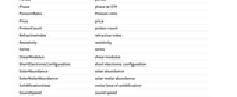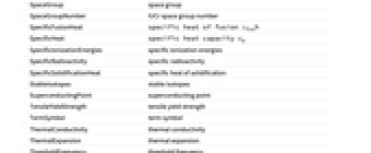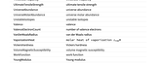 SpecificIonizationEnergies specific ionization energies SpecificRadioactivity specific radioactivity SpecificSolidificationHeat specific heat of solidification StableIsotopes stable isotopes SuperconductingPoint superconducting point TensileYieldStrength tensile yield strength TermSymbol term symbol ThermalConductivity thermal conductivity ThermalExpansion thermal expansion ThresholdFrequency threshold frequency UltimateTensileStrength ultimate tensile strength UniverseAbundance universe abundance UniverseMolarAbundance universe molar abundance UnstableIsotopes unstable isotopes Valence valence ValenceElectronCount valence electron count VanDerWaalsRadius van der Waals radius VaporizationHeat