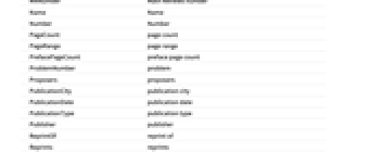 ASIN ASIN AssociatedPeople associated people AssociatedResults associated results Authors authors BookTitle book title Chapter chapter ChapterIn chapter in CommunicationDate communication date DOI DOI Editors editors EntityClasses entity classes EntityTypeList entity type list ERAMNumber ERAM number Errata errata ErratumTo erratum to EuDMLNumber EuDML number FormattedReference reference ISBN10 ISBN‐10 ISBN13 ISBN‐13 Issue issue Item item JFMNumber JFM number Journal journal JSTORNumber JSTOR number Language language Links links MRNumber Math Reviews number Name Name Number Number PageCount page count PageRange page range PrefacePageCount preface page count ProblemNumber problem Proposers proposers PublicationCity publication city PublicationDate publication date PublicationType publication type Publisher publisher ReprintOf reprint of Reprints reprints Solvers solvers Status status ThesisType thesis type Title title TranslationOf translation of Translations translations Translators translators URL URL Volume volume VolumeCount volume count ZblNumber Zentralblatt number