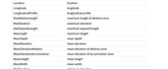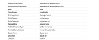 AblationOrientation orientation of ablation zone AccumulationOrientation orientation of accumulation zone Area area Coordinates coordinates DrainageBasins drainage basins EntityClasses entity classes EntityTypeList entity type list ExposedArea exposed area FartherMorainesType farther moraines FrontalCharacteristics frontal characteristics GlacierForm glacier form GlacierID glacier ID Latitude latitude Location location Longitude longitude LongitudinalProfile longitudinal profile MaxAblationLength maximum length of ablation zone MaxElevation maximum elevation MaxExposedLength maximum exposed length MaxLength maximum length MeanDepth mean depth MeanElevation mean elevation MeanElevationAblation mean elevation of ablation zone MeanElevationAccumulation mean elevation of accumulation zone MeanLength mean length MeanWidth mean width MinElevation minimum elevation MinElevationExposed minimum elevation exposed Name name NearestMorainesType nearest moraines NourishmentSource nourishment source Position position PrimaryClassification classification SnowLineElevation snow line elevation SnowLineWithDate snow line elevation TongueActivity tongue activity