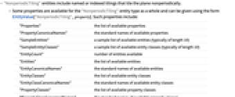 "Qualifiers" 特性の可能な限定子のリスト "QualifierValues" 各限定子に与えることができる値のリスト "DefaultQualifierValues" 特性の限定子のデフォルト値のリスト "Description" 特性についての短いテキストでの説明 "Definition" テキストでの特性についての詳しい説明 "PhysicalQuantity" 実体特性値に関連する物理量 "Unit" 実体特性値に関連する単位 - 限定子の値であるAutomaticは,適用できる形式の値が使えることを意味する.例えば,"Date"限定子には固有の日付や日付範囲が含まれる.