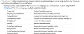 - "PlantDisease"実体には,菌類,細菌,ウイルス等の病原体によって引き起こされる,および環境的な要因によって引き起こされる,よくある植物の病気が含まれている.