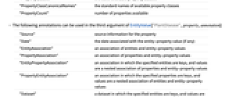 "Source" 特性の出典情報 "Date" 実体特性値に関連する日付(あれば) "EntityAssociation" 実体と実体特性値の連想 "PropertyAssociation" 特性と実体特性値の連想 "EntityPropertyAssociation" 指定の実体がキー,値が特性と実体特性値のネストした連想である連想 "PropertyEntityAssociation" 指定の特性がキー,値が実体と実体特性値のネストした連想である連想 "Dataset" 指定の実体がキー,値が特性名と実体特性値の連想であるデータ集合 - EntityValue[property,annotation]の第2引数として以下の注釈が使える.