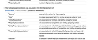 "Source" 特性の出典情報 "Date" 実体特性値に関連する日付(あれば) "EntityAssociation" 実体と実体特性値の連想 "PropertyAssociation" 特性と実体特性値の連想 "EntityPropertyAssociation" 指定の実体がキー,値が特性と実体特性値のネストした連想である連想 "PropertyEntityAssociation" 指定の特性がキー,値が実体と実体特性値のネストした連想である連想 "Dataset" 指定の実体がキー,値が特性名と実体特性値の連想であるデータ集合 - EntityValue[property,annotation]の第2引数として以下の注釈が使える.