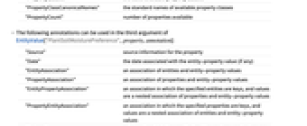 "Qualifiers" 特性の可能な限定子のリスト "QualifierValues" 各限定子に与えることができる値のリスト "DefaultQualifierValues" 特性の限定子のデフォルト値のリスト "Description" 特性についての短いテキストでの説明 "Definition" テキストでの特性についての詳しい説明 "PhysicalQuantity" 実体特性値に関連する物理量 "Unit" 実体特性値に関連する単位 - 限定子の値であるAutomaticは,適用できる形式の値が使えることを意味する.例えば,"Date"限定子には固有の日付や日付範囲が含まれる.