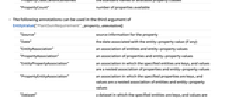 "Source" 特性の出典情報 "Date" 実体特性値に関連する日付(あれば) "EntityAssociation" 実体と実体特性値の連想 "PropertyAssociation" 特性と実体特性値の連想 "EntityPropertyAssociation" 指定の実体がキー,値が特性と実体特性値のネストした連想である連想 "PropertyEntityAssociation" 指定の特性がキー,値が実体と実体特性値のネストした連想である連想 "Dataset" 指定の実体がキー,値が特性名と実体特性値の連想であるデータ集合 - EntityValue[property,annotation]の第2引数として以下の注釈が使える.