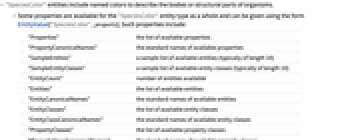 - 特性の中には,"SpeciesColor"実体タイプ全体について使え,EntityValue["SpeciesColor",property]の形式を使って得られるものもある.そのような特性には以下が含まれる.