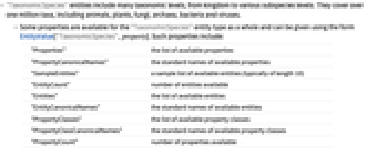 - 特性の中には,"TaxonomicSpecies"実体タイプ全体について使え,EntityValue["TaxonomicSpecies",property]の形式を使って得られるものもある.そのような特性には以下が含まれる.