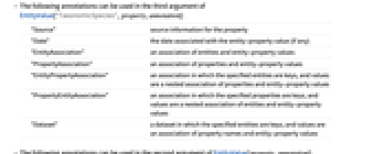 "Source" 特性の出典情報 "Date" 実体特性値に関連する日付(あれば) "EntityAssociation" 実体と実体特性値の連想 "PropertyAssociation" 特性と実体特性値の連想 "EntityPropertyAssociation" 指定の実体がキー,値が特性と実体特性値のネストした連想である連想 "PropertyEntityAssociation" 指定の特性がキー,値が実体と実体特性値のネストした連想である連想 "Dataset" 指定の実体がキー,値が特性名と実体特性値の連想であるデータ集合 - EntityValue[property,annotation]の第2引数として以下の注釈が使える.