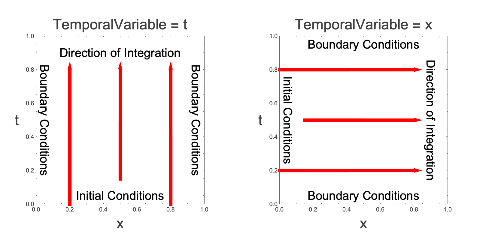 偏微分方程式を解くのに線の方法が使われる場合には,時間変数が選ばれなければならない.これは積分の方向を定義する.境界条件と初期条件の数は,方程式から見て取れる.例えば,