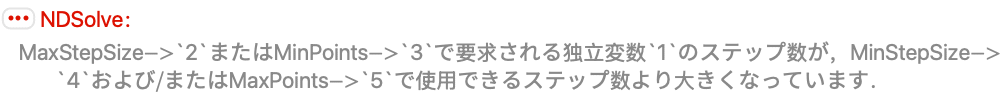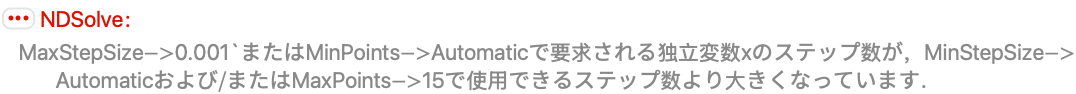 エラーとなるのは,MaxStepsオプションの値によって与えられる指定とMaxStepSizeオプションの値によって与えられる指定の両方を満足することのできる刻み幅がないためである: