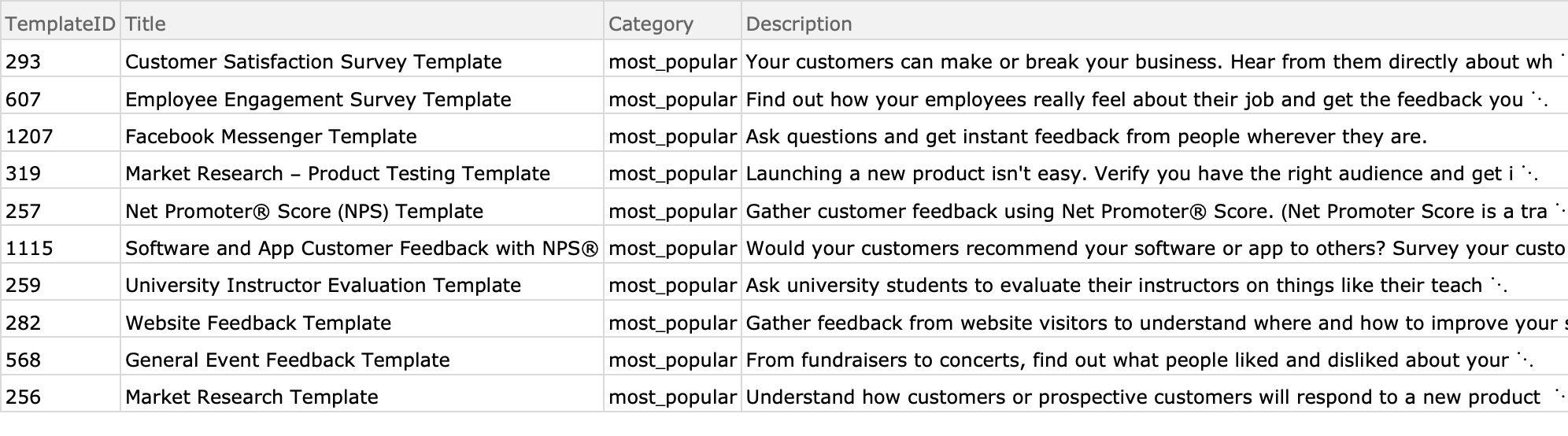 "TemplateList" — retrieves a paged list of templates provided by SurveyMonkey