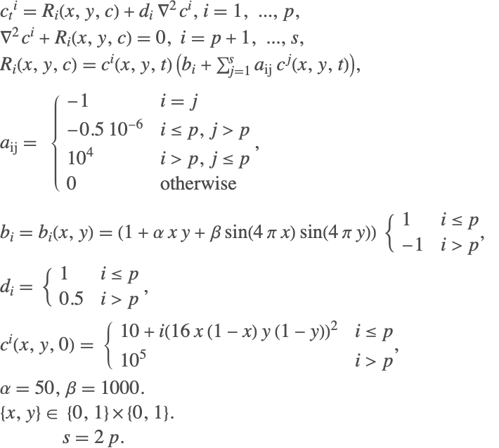 下面是一个合成示例,求解以非线性方式耦合在一起的抛物线和椭圆偏微分方程. 偏微分方程的空间离散化导致一个含有显著数量个代数变量的系统. 方程的设置使得解析解存在于系统. 以下给出耦合系统的详细信息.