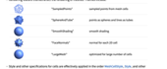 "SampledPoints" sampled points from mesh cells "SphereAndTube" points as spheres and lines as tubes "SmoothShading" smooth shading "FaceNormals" normal for each 2D cell "LargeMesh" optimized for large number of cells - Style and other specifications for cells are effectively applied in the order MeshCellStyle, Style, and other wrappers, with later specifications overriding earlier ones.
