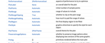 AspectRatio 1/GoldenRatio ratio of width to height Axes True whether to draw axes ClippingStyle None what to draw where curves are clipped ColorFunction Automatic how to determine the coloring of curves ColorFunctionScaling True whether to scale arguments to ColorFunction Filling None filling to insert under each curve FillingStyle Automatic style to use for filling MaxRecursion Automatic the maximum number of recursive subdivisions allowed Mesh None how many mesh points to draw on each curve MeshFunctions {#1&} how to determine the placement of mesh points MeshShading None how to shade regions between mesh points MeshStyle Automatic the style for mesh points Method Automatic methods to use PerformanceGoal $PerformanceGoal aspects of performance to try to optimize PlotPoints Automatic initial number of sample points PlotRange Automatic range of values to include PlotRangeClipping True whether to clip at the plot range PlotStyle Automatic graphics directives to specify the style for each object PlotTheme $PlotTheme overall theme for the plot RegionFunction (True&) how to determine whether a point should be included ScalingFunctions None how to scale individual coordinates Spacings Automatic space between plot axes WorkingPrecision MachinePrecision the precision used in internal computations for symbolic distributions - Possible settings for PlotOrigin include "XAxis" and "YAxis".