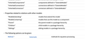 "ExtendsModels" models this model extends "Components" model components "Connections" model connections "Connectors" model connector components "LocalComponents" components defined locally in model "LocalConnections" connections defined locally in model "LocalConnectors" connectors defined locally in model "InheritedComponents" components defined in "ExtendsModels" "InheritedConnections" connections defined in "ExtendsModels" "InheritedConnectors" connectors defined in "ExtendsModels" - Properties related to relations with other models:
