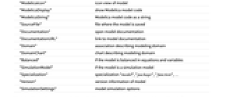 "Description" top-level description of model "Summary" model summary data "ModelName" fully qualified path of model "Diagram" diagram view of model "ModelicaIcon" icon view of model "ModelicaDisplay" show Modelica model code "ModelicaString" Modelica model code as a string "SourceFile" file where the model is saved "Documentation" open model documentation "DocumentationURL" link to model documentation "Domain" association describing modeling domain "DomainChart" chart describing modeling domain "Balanced" if the model is balanced in equations and variables "SimulationModel" if the model is a simulation model "Specialization" specialization "model", "package", "function", … "Version" version information of model "SimulationSettings" model simulation options - "ModelicaDisplay" creates a cell with style "Program" containing the textual form of "model".