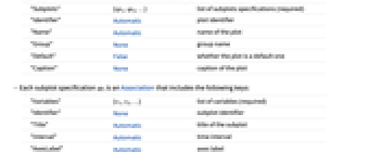 "Subplots" {sp1,sp2,…} list of subplots specifications (required) "Identifier" Automatic plot identifier "Name" Automatic name of the plot "Group" None group name "Default" False whether the plot is a default one "Caption" None caption of the plot - Each subplot specification spi is an Association that includes the following keys: