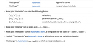 {"v1","v2",…} variables vi {{"v1,x","v1,y"},…} parametric plot of vi,x vs vi,y {{"v1","p1",d1},…} sensitivity bounds around vi for pi varying 100 di% - Model plot "Interval" can be given as {tmin,tmax} or tmax.