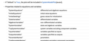 "SystemEquations" differential and algebraic equations "InitialEquations" initial value equations "InitialSeedings" guess values for initialization "StateVariables" differentiated variables "AlgebraicVariables" non-differentiated variables "SystemVariables" state and algebraic variables "TopSystemVariables" system variables excluding component variables "InputVariables" variables specified as inputs "OutputVariables" variables specified as outputs "ParameterNames" parameters "TopParameterNames" parameters excluding component parameters "DiscreteVariables" variables changing only at events - "SystemEquations" gives equations depending on t.