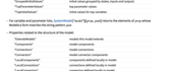 "ParameterValues" parameter rules {p1->val1,…} "InitialValues" initial value rules {v1->val1,…} "GroupedInitialValues" initial values grouped by states, inputs and outputs "TopParameterValues" top parameter values "TopInitialValues" initial values for top variables - For variable and parameter lists, SystemModel["model"][{prop,patt}] returns the elements of prop whose Modelica form matches the string pattern patt.