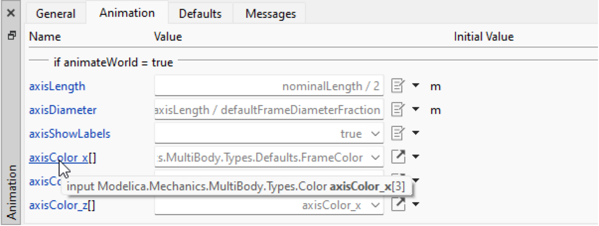 Modelica関数では入力のデフォルト値が許可されているため,関数呼び出しで値が指定されなかった入力でも,デフォルト値の形式で値が設定されているように見える場合がある.デフォルト値は関数呼び出しで指定された値と区別できるように,灰色のテキスト色で表示される.
